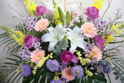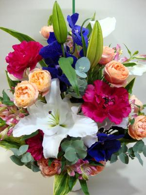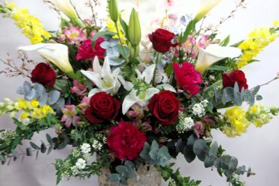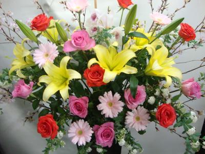 【お祝い花】 プロにおまかせ 豪華アレンジメント「ピンク・赤系」