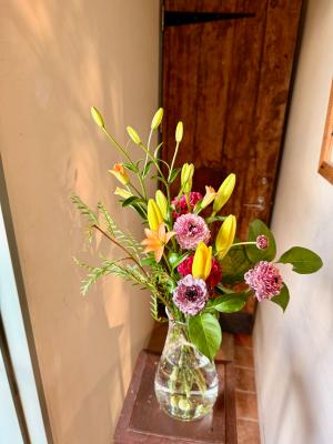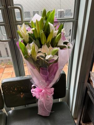 ピンクユリを入れたピンク系おまかせアレンジ