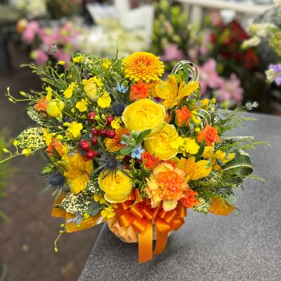 オレンジバラ入れたオレンジ・イエロー系おまかせアレンジ