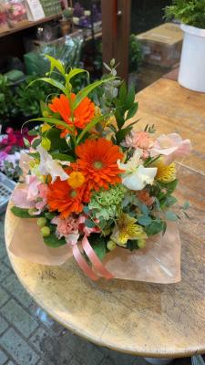 オレンジバラ入れたオレンジ・イエロー系おまかせアレンジ