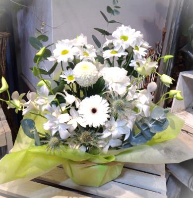 ★ホワイト ガーベラ入り★白+紫系でおまかせ盛花