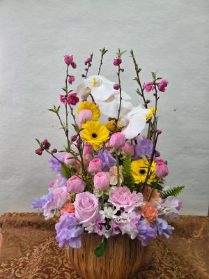 【お祝い花】 プロにおまかせ 豪華アレンジメント「ピンク・赤系」