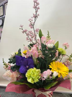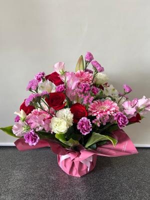 【お祝い花】プロにおまかせ 豪華アレンジメント「ピンク・赤系」