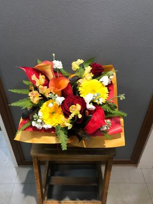 オレンジバラ入れたオレンジ・イエロー系おまかせアレンジ