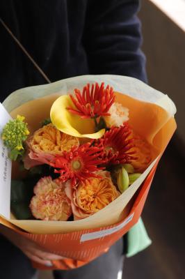 オレンジバラ入れたオレンジ・イエロー系おまかせアレンジ