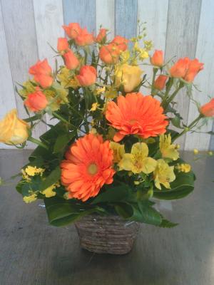 オレンジバラ入れたオレンジ・イエロー系おまかせアレンジ