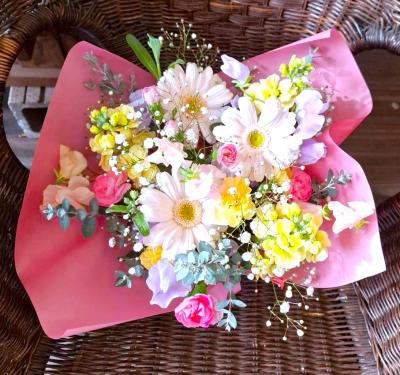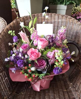 トルコギキョウ入れたピンク・パープル系おまかせアレンジ