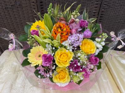 オレンジバラ入れたオレンジ・イエロー系おまかせアレンジ