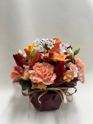 オレンジバラ入れたオレンジ・イエロー系おまかせアレンジ