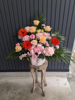 【お祝い花】 プロにおまかせ 豪華アレンジメント「ピンク・赤系」