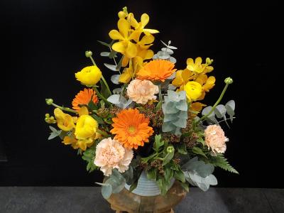 オレンジバラ入れたオレンジ・イエロー系おまかせアレンジ