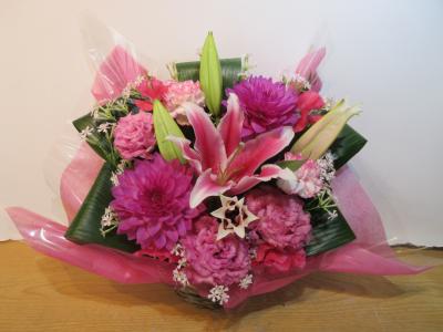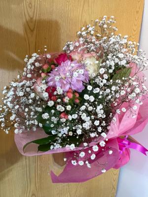 母の日!ピンクと赤のまんまる可愛いアレンジメント(かすみ草)