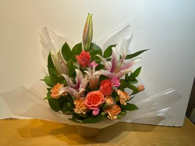 八重咲きゆりとカーネーションの母の日アレンジメント(バラ入り)