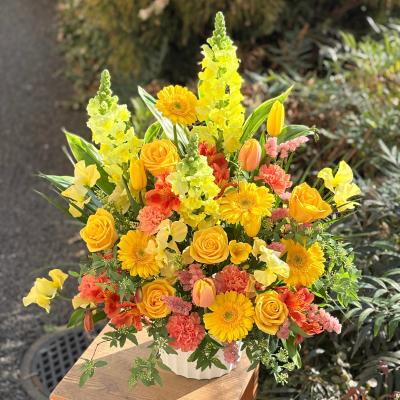 オレンジバラ入れたオレンジ・イエロー系おまかせアレンジ