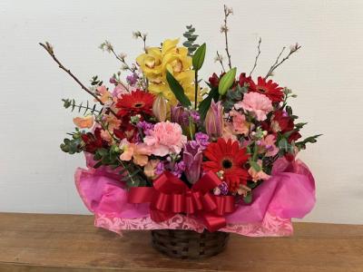 【お祝い花】 プロにおまかせ 豪華アレンジメント「ピンク・赤系」