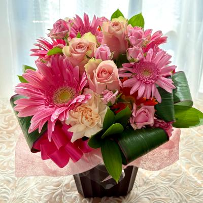 キュートなアレンジメント PinkEssence (ガーベラとバラのフラワーアレンジメント)ピンク系 誕生日、結婚記念日、お祝い、発表会、コンサート、ライブ