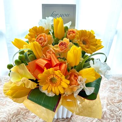 プチ贅沢なアレンジメント Yellow fun (チューリップのフラワーアレンジメンント)イエローオレンジ系
